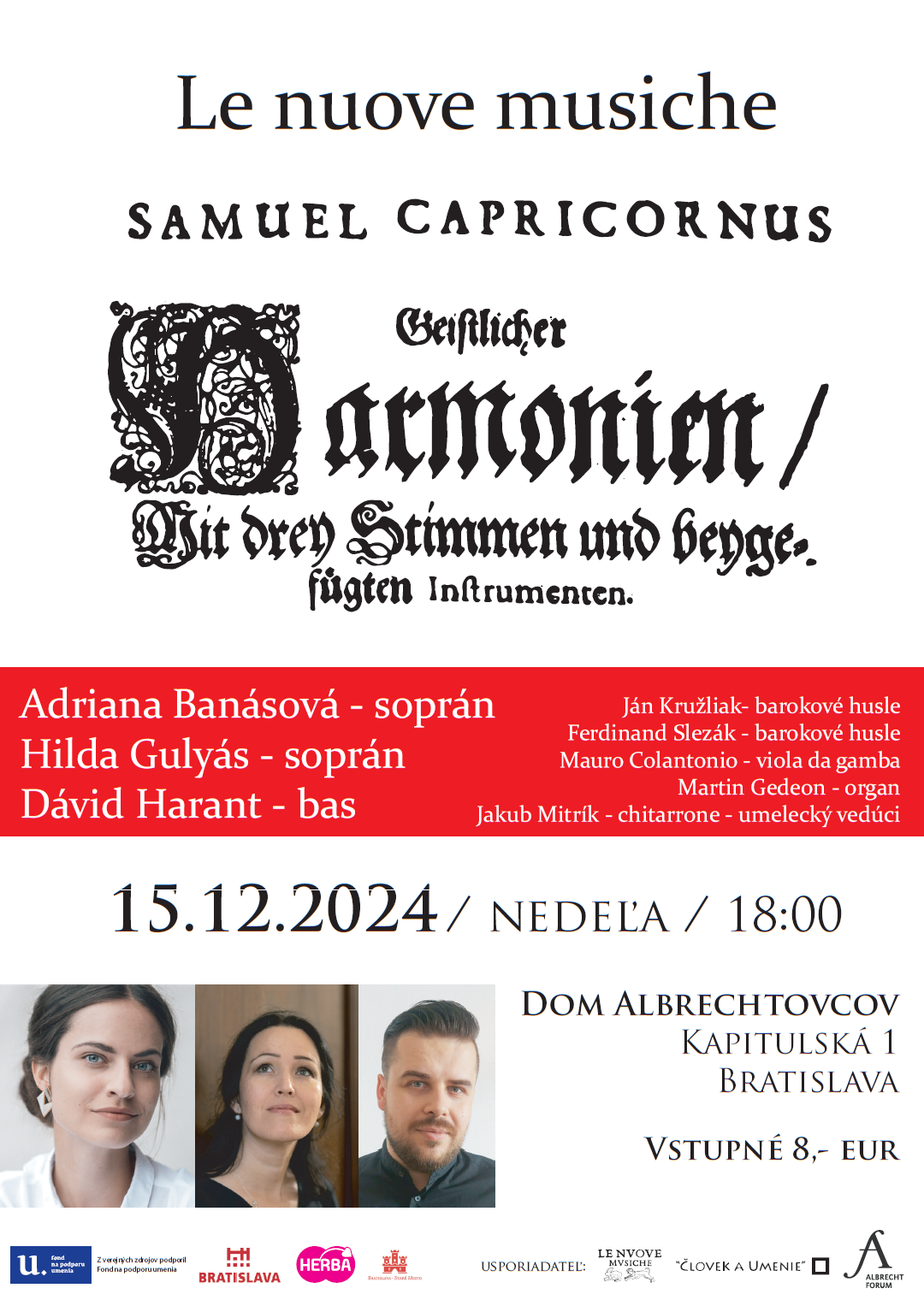 SAMUEL CAPRICORNUS patril k významným skladateľom 17. storočia a jeho dielo je dochované v mnohých knižniciach po celej Európe. Počas svojho, žiaľ, krátkeho života skomponoval Capricornus pomerne veľa hudby. Tá sa zachovala v mnohých rukopisoch ako aj tlačiach. Napriek tomu, že počas svojho života bol Capricornus uznávaným skladateľom a precestoval veľkú časť Európy, dnes je jeho dielo pomerne málo hrávané. Do tejto kategórie spadá aj jeho trojzväzkové dielo Geistliche Harmonien I-III. Práve vyber z týchto kompozícii zaznie na našom koncerte.