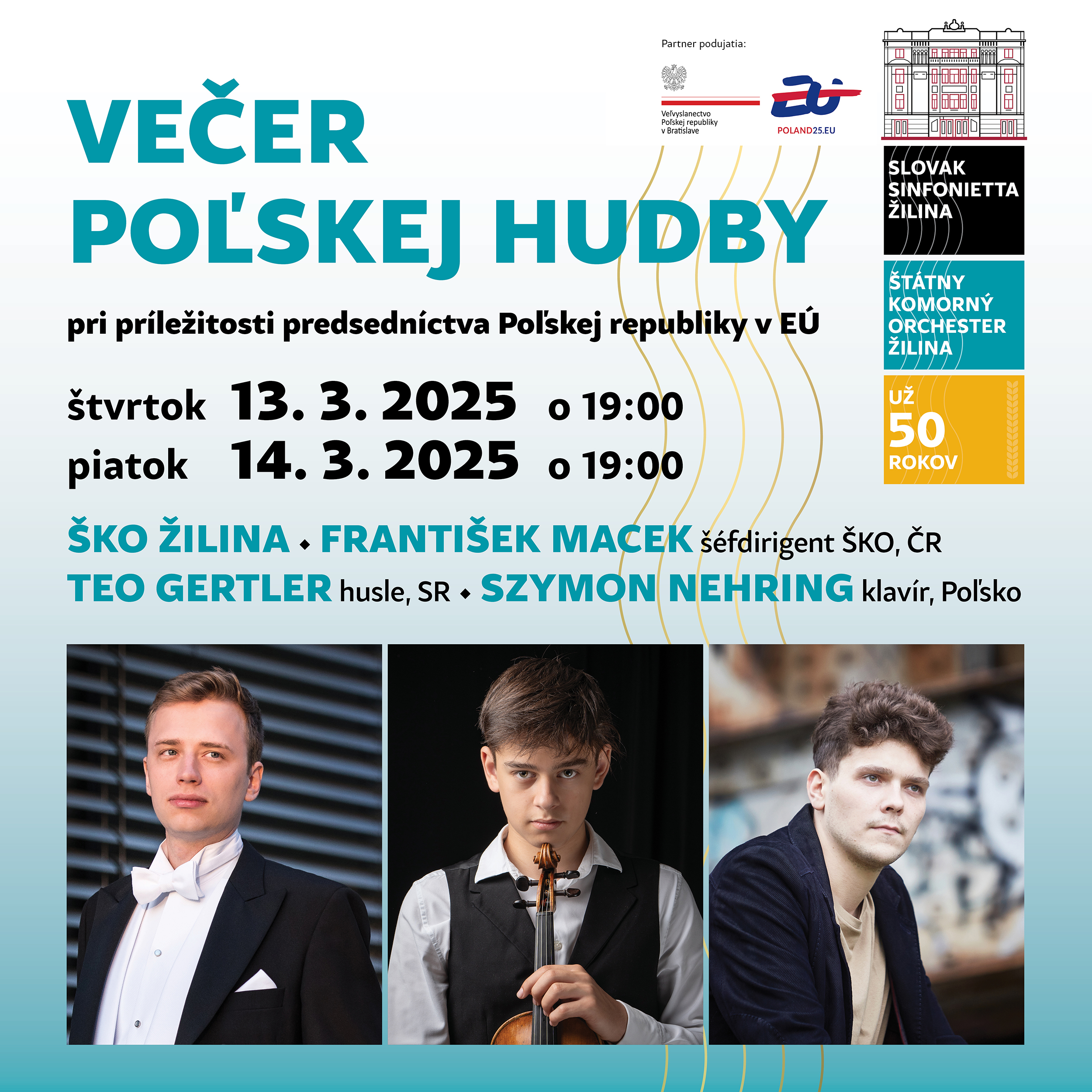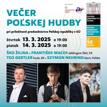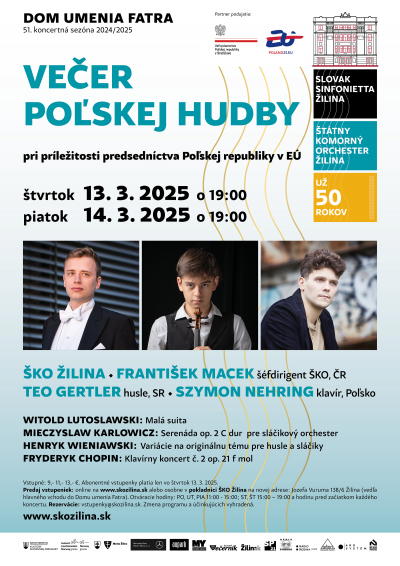 Koncert pri príležitosti predsedníctva Poľska v EÚ prinesie do Žiliny diela najvýznamnejších poľských skladateľov v podaní skvelých slovenských, českých a poľských umelcov. Sme radi, že vystúpia laureáti najvýznamnejších poľských medzinárodných interpretačných súťaží - Teo Gertler (Wieniawskeho husľová súťaž), Szymon Nehring (Chopinova klavírna súťaž) a František Macek (dirigentská súťaž NOSPR Katowice).