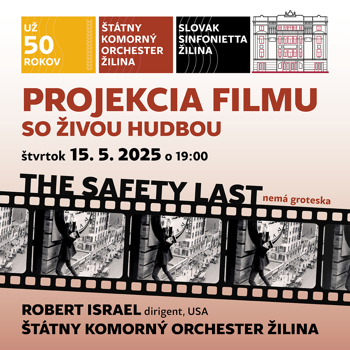 Po veľkom úspechu filmovej grotesky Frigo sa žení v podaní ŠKO a dirigenta Roberta Israela s využitím projekčného plátna v DUF, prináša tento skvelý dirigent a skladateľ ďalší zaujímavý projekt - slávnu nemú grotesku The Safety Last (O poschodie vyššie) s hviezdnym Haroldom Lloydom. Americký filmový herec-komik, kaskadér a producent, jedna z veľkých amerických filmových hviezd éry nemých grotesiek nakrútil medzi rokmi 1913 až 1947 približne 200 nemých aj zvukových grotesiek a komédií.