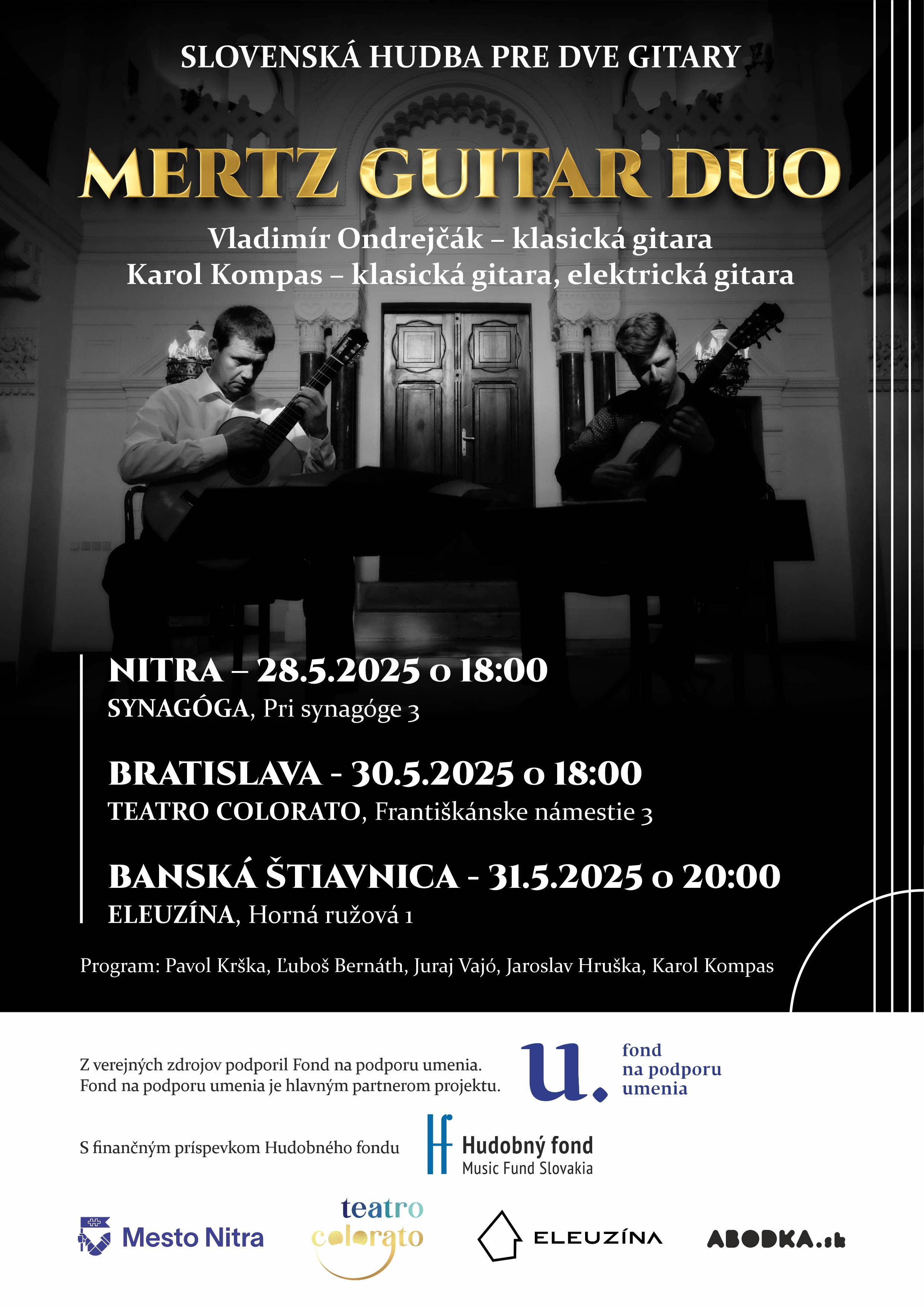srdečne pozývame na tri najbližšie koncerty "SLOVENSKÁ HUDBA PRE DVE GITARY". MERTZ GUITAR DUO predstaví diela súčasných slovenských skladateľov Pavol Krška, Ľuboš Bernáth, Juraj Vajó, Jaroslav Hruška a Karol Kompas.