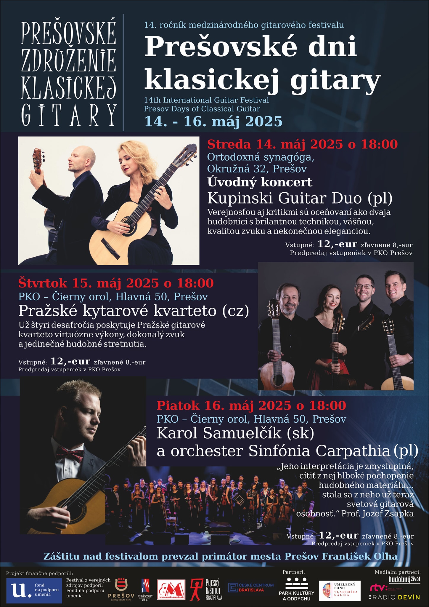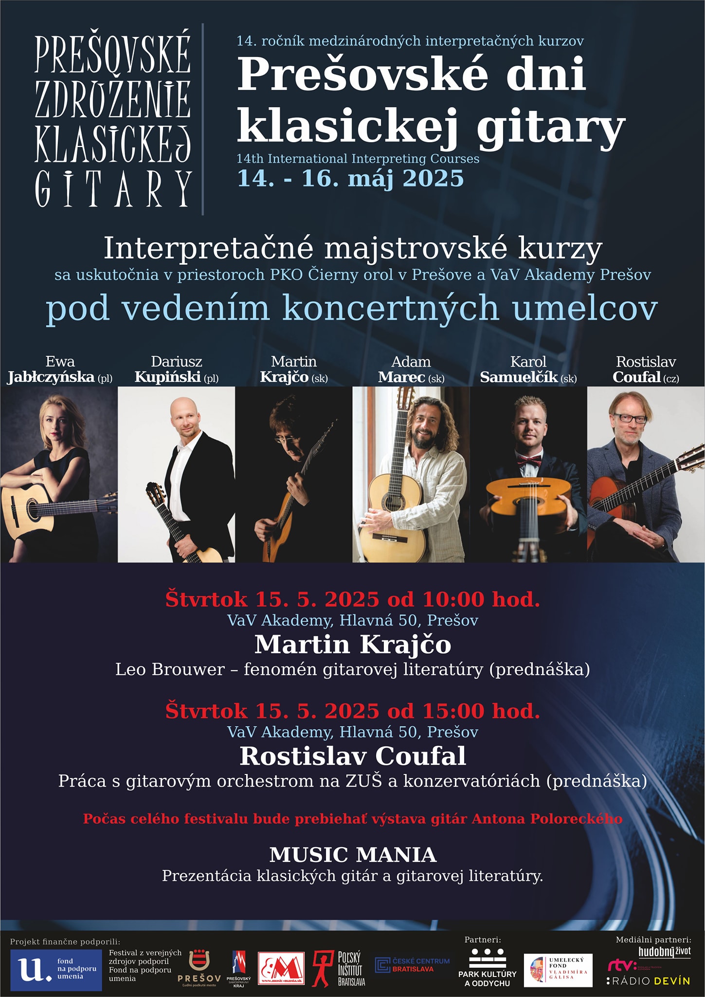 Prešovské združenie klasickej gitary v spolupráci s PKO Prešov Vás pozývajú na 14. ročník medzinárodného gitarového festivalu Prešovské dni klasickej gitary, ktorý sa koná v dňoch 14. - 16. mája 2025 v Prešove. Súčasťou festivalu sú majstrovské interpretačné kurzy pod vedením koncertných umelcov a pedagógov: