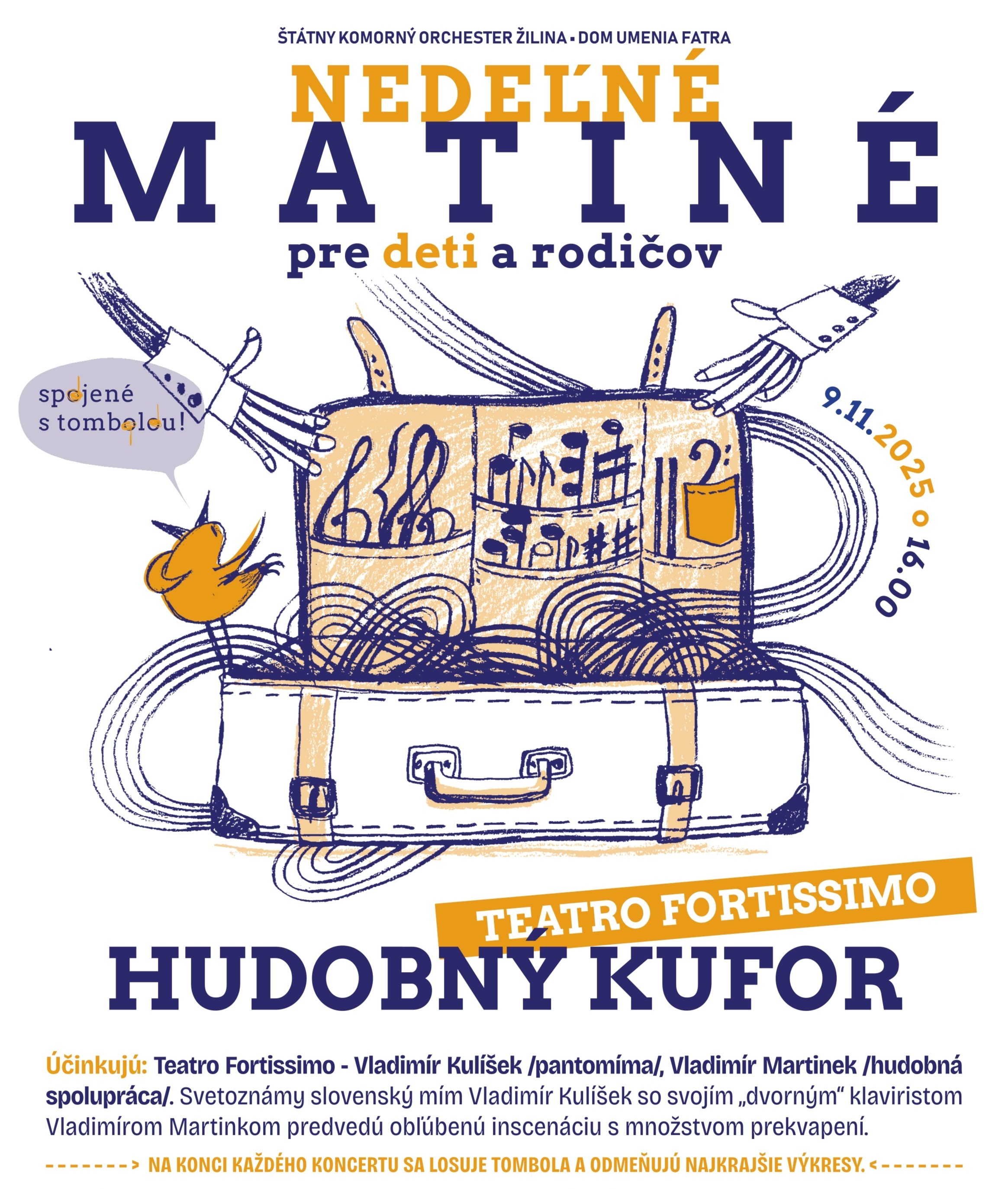 Svetoznámy slovenský mím Vladimír Kulíšek so svojím ,,dvorným" klaviristom Vladimírom Martinkom predvedú obľúbenú inscenáciu ,,Hudobný kufor" s množstvom prekvapení.